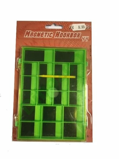 Dubbele hakendoos, aan beide kanten zit magneetvakken. Pinnetje met magneetje om de haak uit de hakendoos te halen.