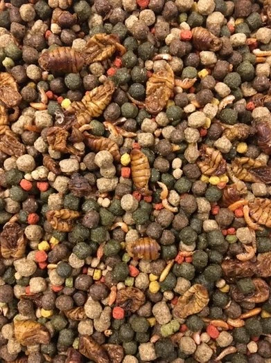 Mix van 3 en 6 mm koikorrels aangevuld met insecten zoals zijderups en kreeftjes, is geschikt voor alle koi’s