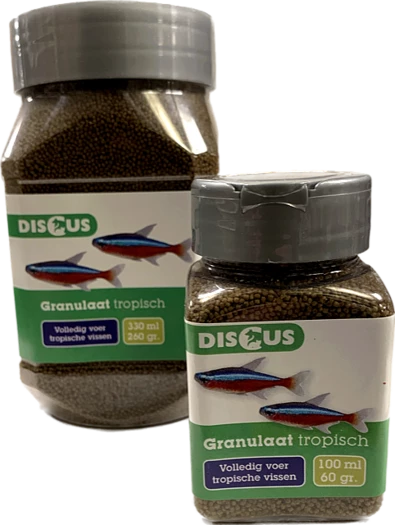Drijvende korrels voor tropische vissen. Korrels zitten in een handige strooipot. Voer 1 รก 2 keer per dag een heel klein beetje, het moet binnen enkele minuten op zijn. Overtolig voer van de bodem verwijderen met een schepnetje.