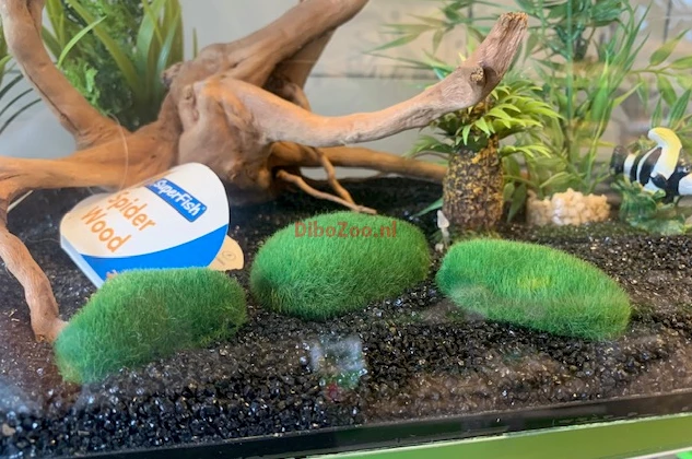 Stenen met imitatie mos om uw aquariumbodem te decoreren, vooral op zwart aquariumgrind valt deze groenen stenen helemaal op.