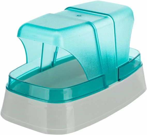 Kunststof zandbad met 2 ingangen. Kap kan eraf in verband met schoonmaken.